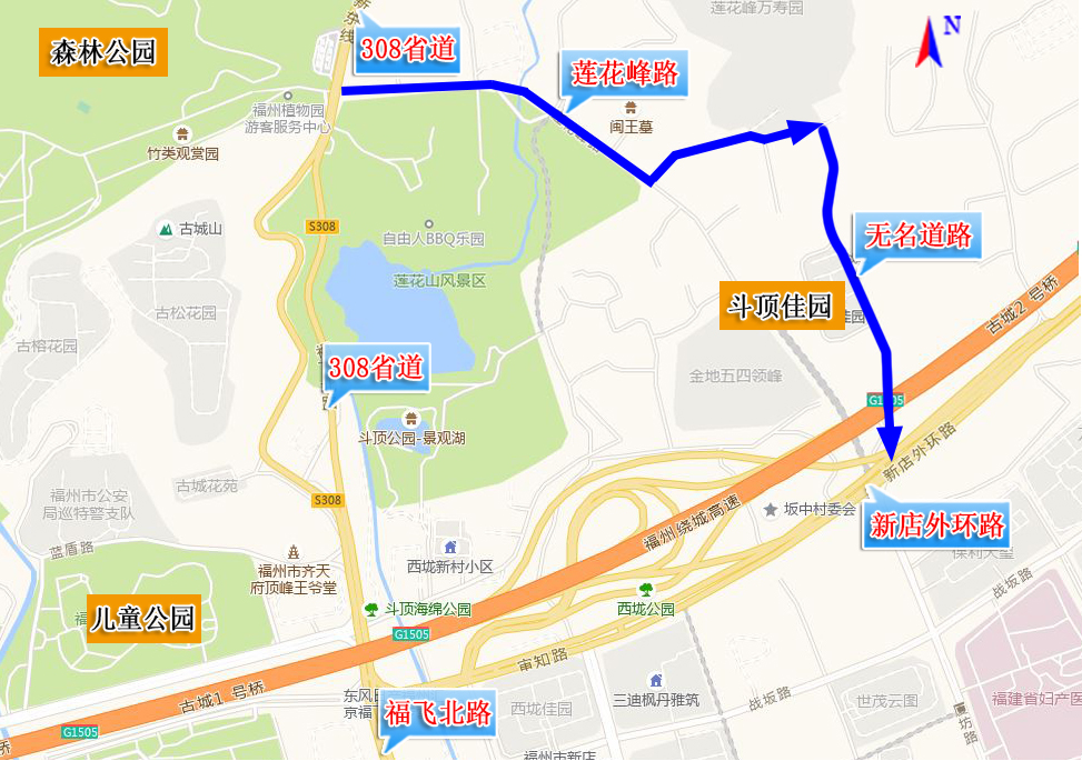 (二)斗顶佳园东侧无名道路(北起莲花峰路口,南至新店外环路口)实行机动车由北往南单向通行。