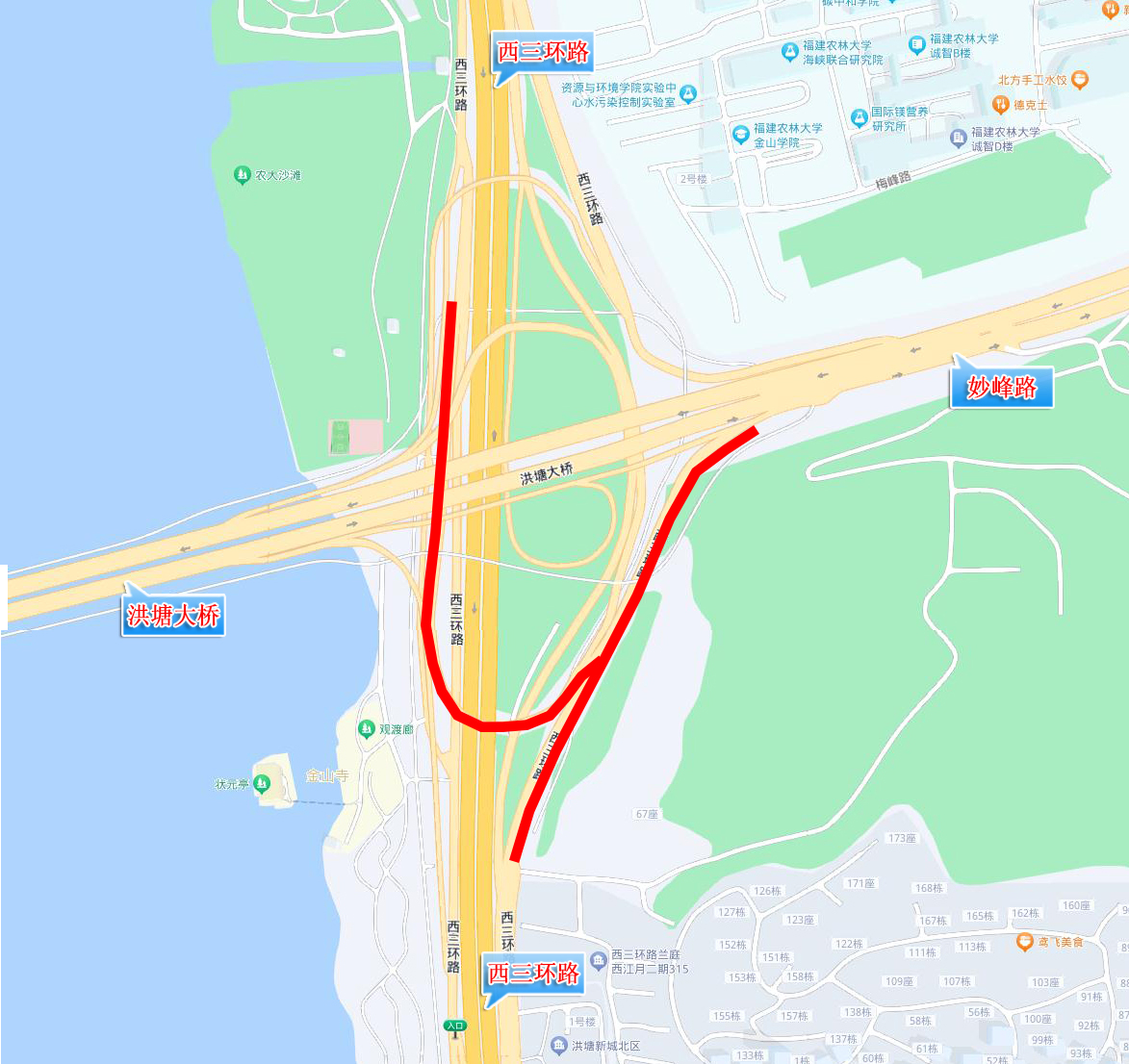 (一)洪塘互通北往东左转往妙峰路方向匝道禁止机动车(除公交车外)通行。