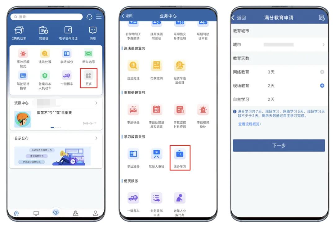 “交管12123”APP → 更多 → 业务中心 → 学习教育业务 → 满分学习考试。机动车驾驶人可以选择驾驶证核发地或者交通违法行为发生地、处理地参加满分教育。