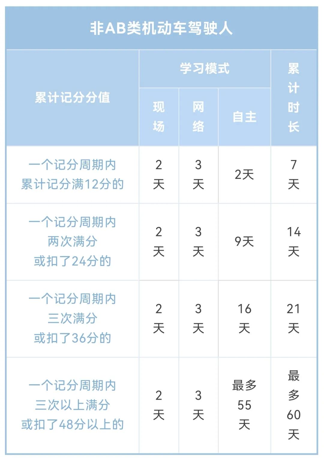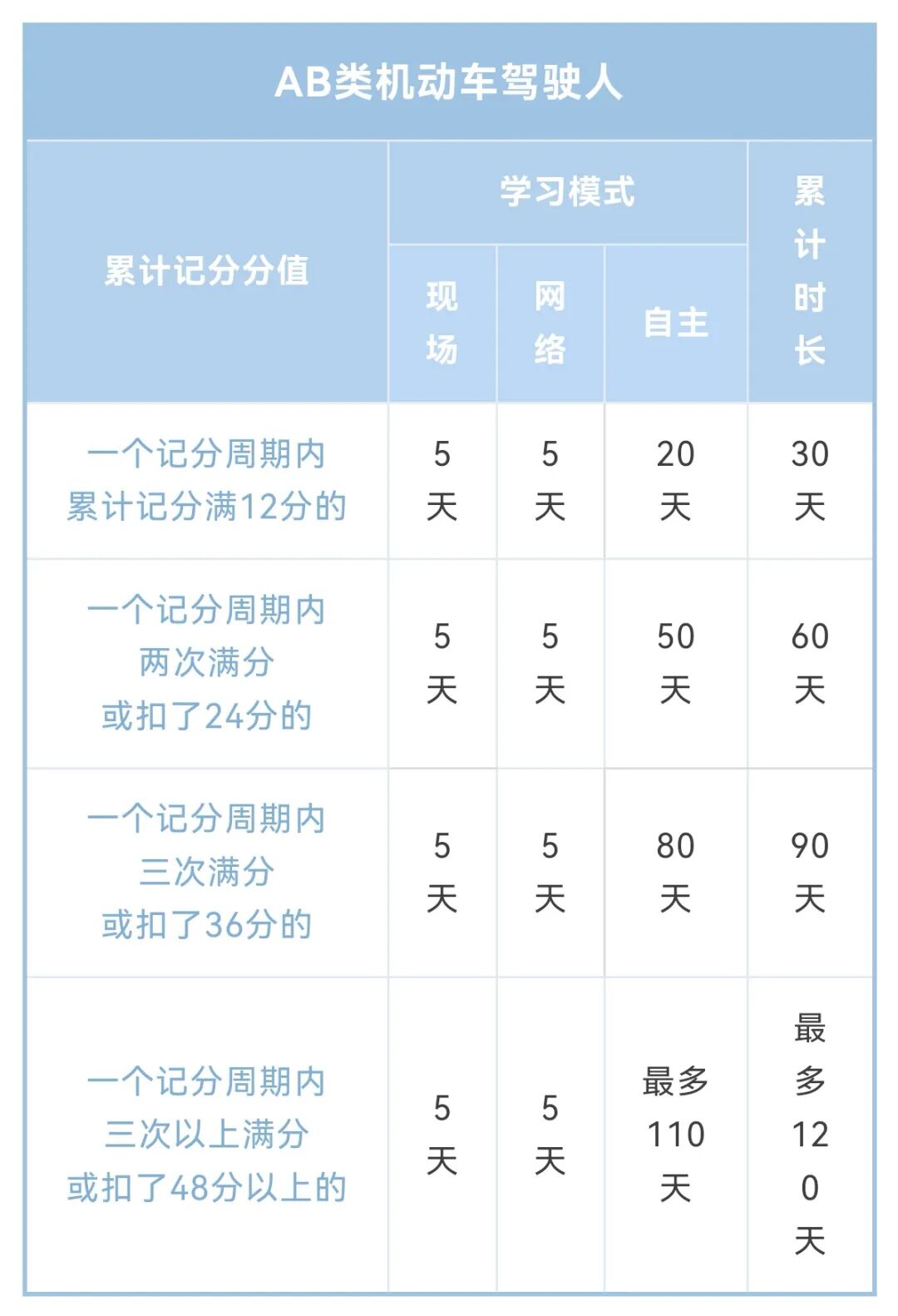 机动车驾驶人参加现场学习、网络学习的天数累计不得少于五天,其中,现场学习的天数不得少于二天