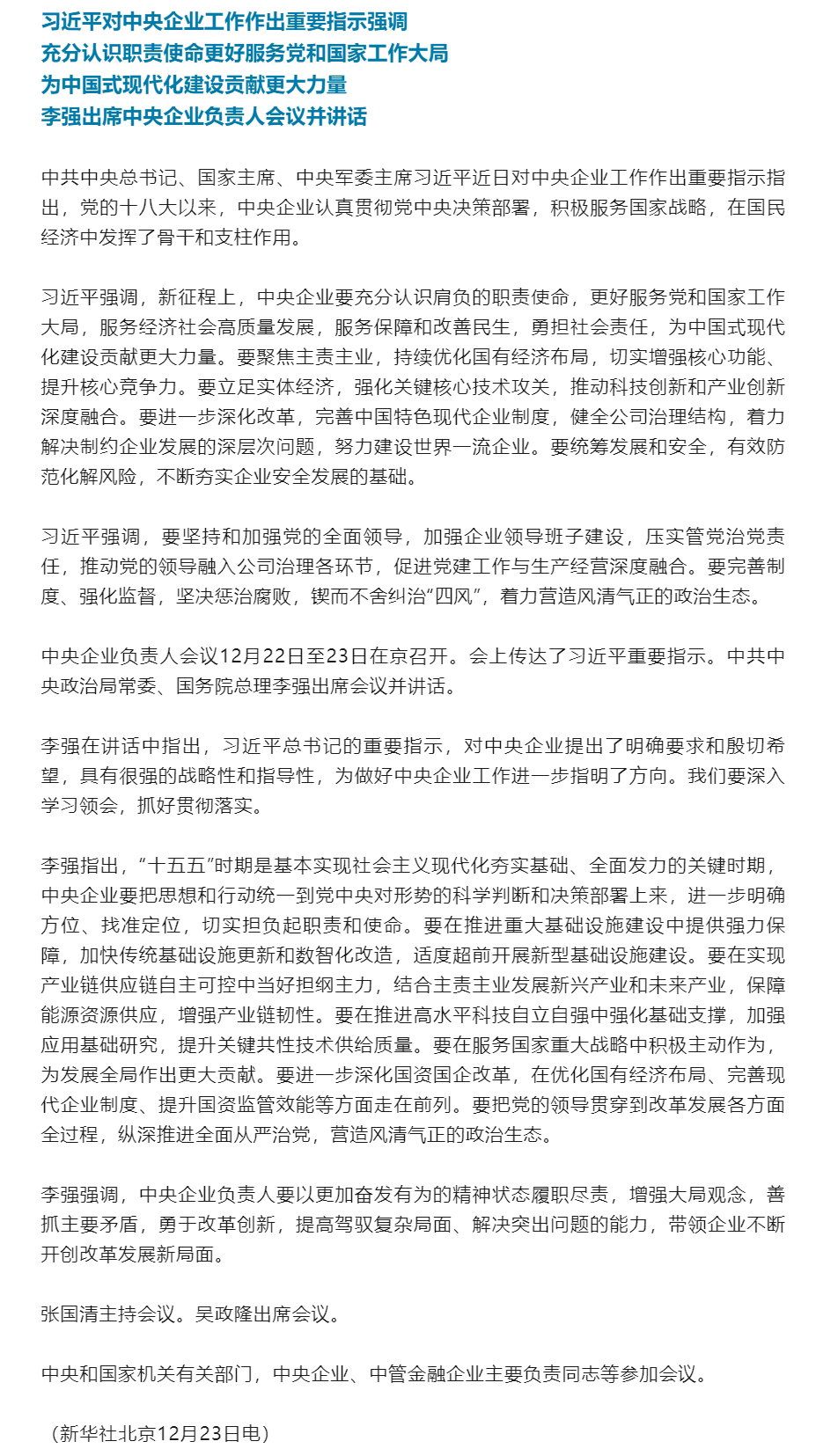习近平对中央企业工作作出重要指示
