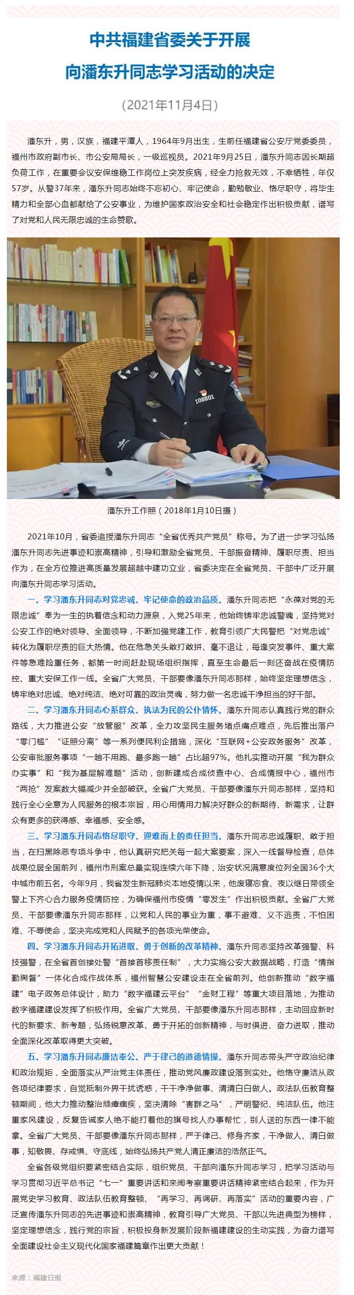 中共福建省委关于开展向潘东升同志学习活动的决定