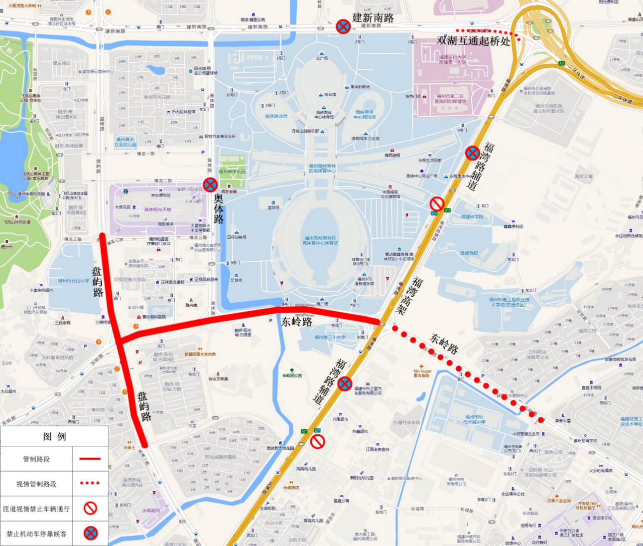 21:00至观众撤场完毕,福湾路(双湖环岛至东岭路)、奥体路(东岭路至建新南路)、建新南路(奥体路至双湖环岛)等3条道路禁止机动车(公交车除外)停靠候客。