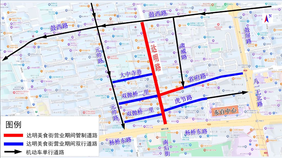 四、双抛桥一里、双抛桥二里、大中寺巷和虎节路(西起达明路口,东至东百中心西侧通道口)周末和法定节假日11时至23时、工作日17时至23时,允许机动车双向通行。